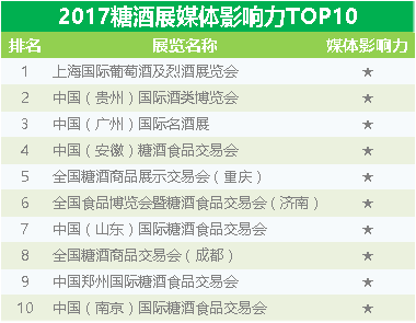 今天解读的2017中国糖酒展TOP10排行榜分“中国糖酒展面积TOP10”、“中国糖酒展展商吸引力TOP10”和“中国糖酒展媒体影响力TOP10”三大榜单,分别以展出面积、展商吸引力和媒体影响力三个维度来反映展会的综合实力和影响力。